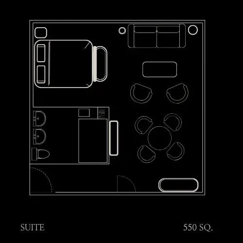 A spacious suite featuring a living area, dining space, and luxurious bathroom, all framed by sweeping Gaslamp views. Ideal for extended stays or family accommodations and can adjoin with Double Rooms.